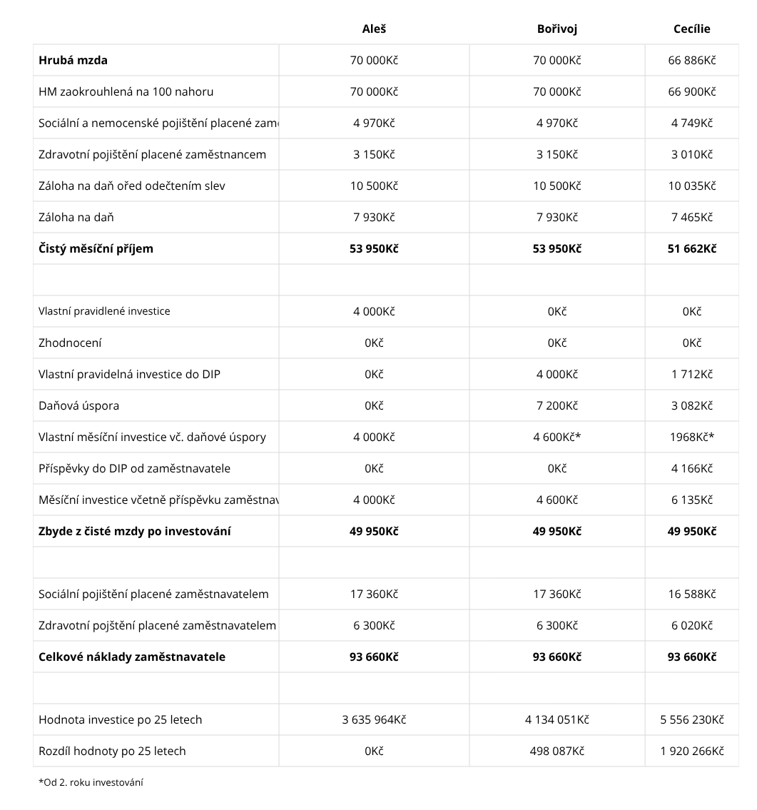 Představme si tři kolegy, Aleše, Bořivoje a Cecílii. Všichni pracují na podobné pozici, mají stejnou hrubou mzdu 70 000 Kč a zaměstnavatele stojí stejných 93 660 Kč měsíčně. Každému z nich po investici zůstává stejný čistý příjem 49 950 Kč. Rozdíl je pouze v tom, jak chytře s penězi naloží.