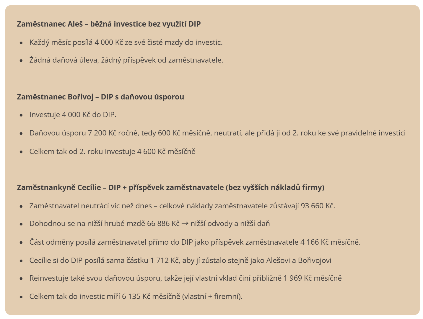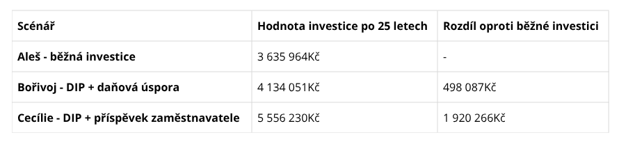 Zaměstnavatel Cecílii část odměny neposlal jako mzdu, ale posílá jí rovnou do DIP. Cecílii to nestojí nic navíc, firmu také ne, jen se chytřeji rozdělí balíček odměny. V součtu investuje více než Aleš a více než Bořivoj, ale nemá to vliv na její rodinný rozpočet. Tyto prostředky ale okamžitě začínají pracovat a dlouhodobě dramaticky zvyšují výsledek.